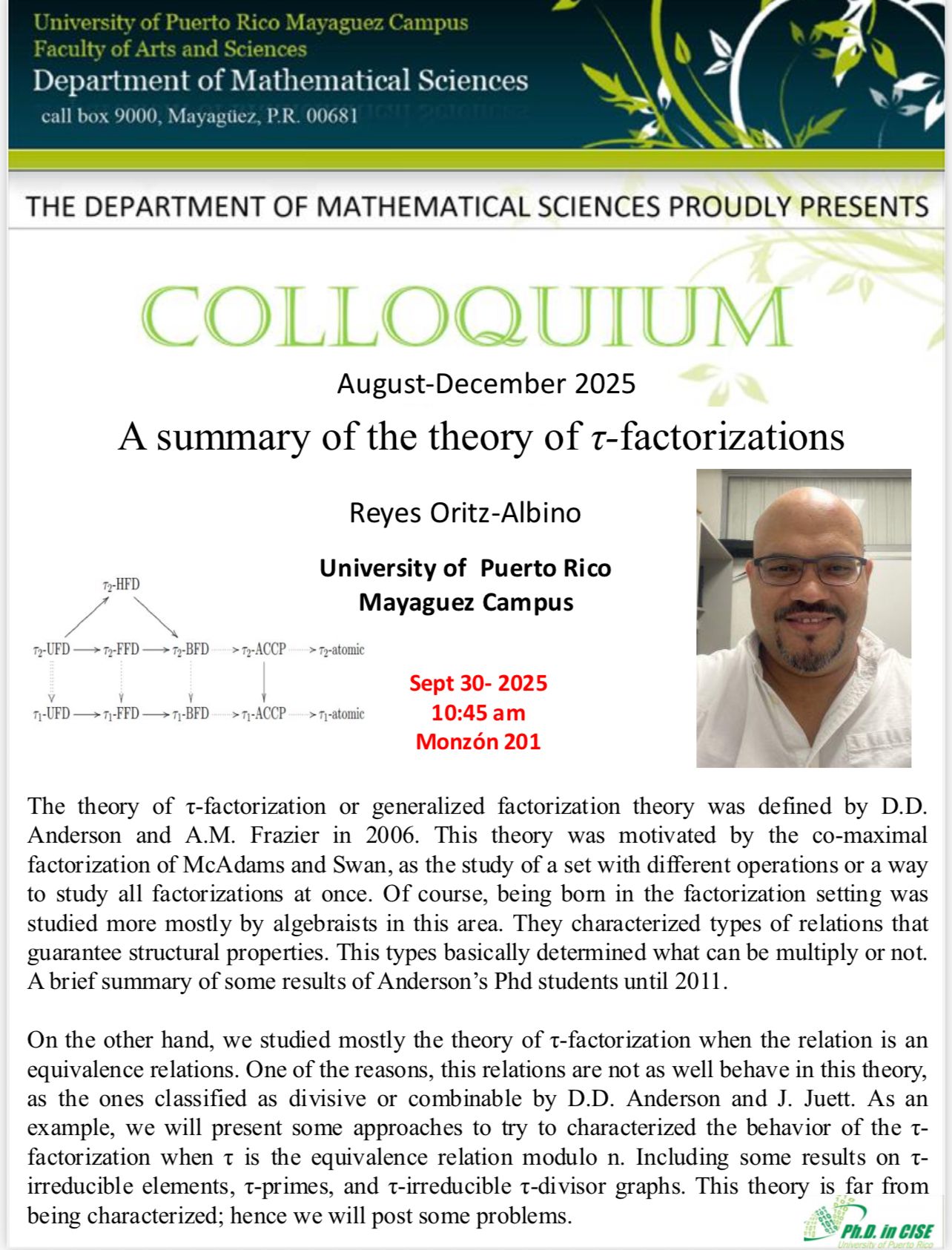 Dr. Reyes Ortiz-Albino | UPR Mayaguez | A summary of the theory of tao-factorizations | Sept 30 |