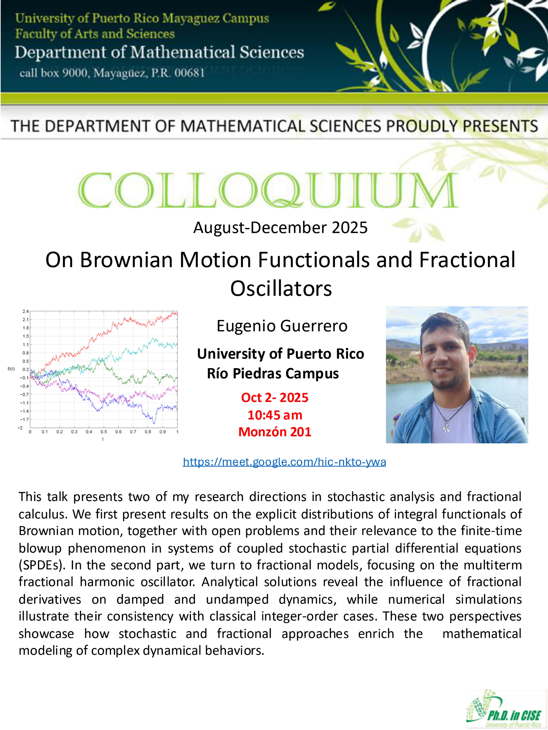 Dr. Eugenio Guerrero | UPR Rio Piedras | On Brownian Motion Functionals and Fractional Oscillators | Oct 2 |